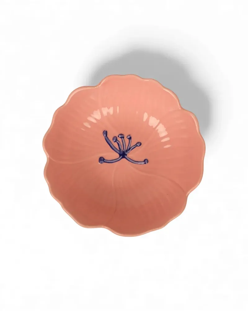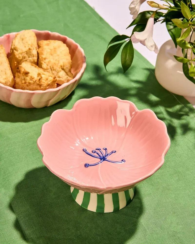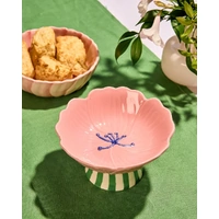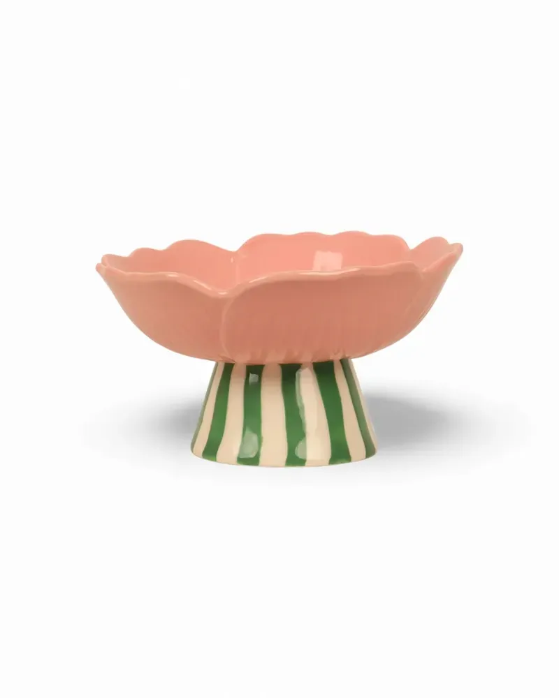 Delicate in form yet designed for everyday use, the Blush Stoneware Flower Bowl Stand brings soft colour and sculptural beauty to your table. Shaped like a blooming flower, this stoneware bowl features gently fluted edges and hand-painted detailing in warm blush tones, finished with vibrant green striped raised stand, for an unexpected pop of contrast. Crafted from durable stoneware with a glossy glaze, the bowl’s organic shape adds visual interest while remaining practical and versatile. Perfect for serving snacks, dips, desserts or as a fruit bowl, it also works beautifully as a decorative piece on a coffee table or open shelf. The floral-inspired silhouette brings a sense of charm and artistry to both casual and styled settings.