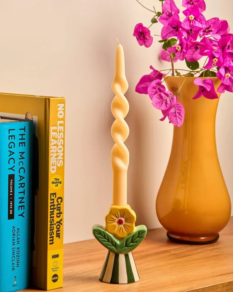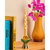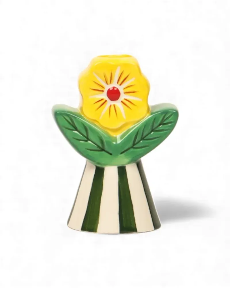 Bring a playful, nostalgic touch to your home with the Retro Folk Stoneware Candle Holder. Designed to make a statement, this sculptural piece blends folk-inspired motifs with bold colour and texture, creating a decorative accent that feels both whimsical and timeless. Crafted from glazed stoneware, the candle holder features a fluted base with hand-painted stripes, topped with a raised floral detail and leafy accents in rich green and warm yellow tones. Designed to hold a tapered candle, its sturdy base provides stability while the detailed finish adds character whether lit or styled as a standalone object. Perfect for styling on a mantel, dining table or bookshelf, this stoneware candle holder brings warmth and charm to both everyday interiors and special occasions. Ideal as a thoughtful gift or a statement piece for your own home, the Retro Folk Stoneware Candle Holder pairs beautifully with other pieces from the Retro Folk range.