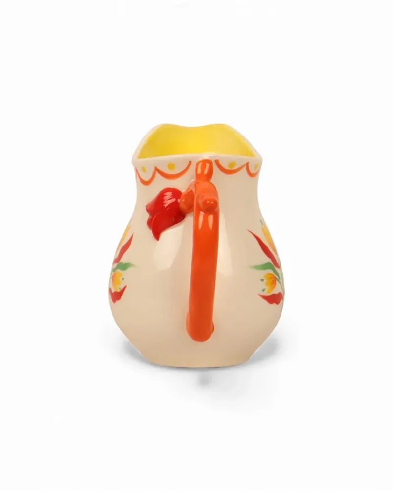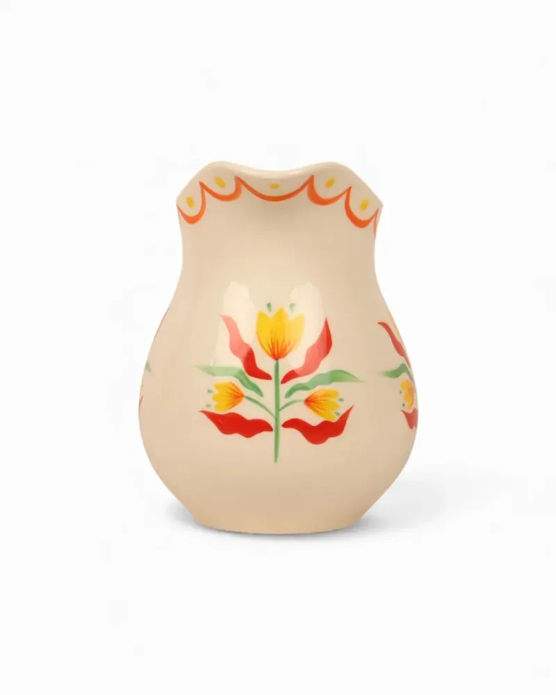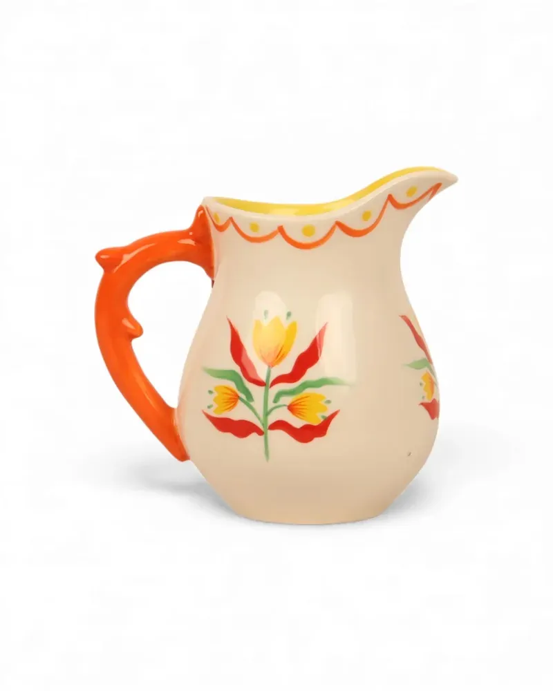 Bring warmth, colour and handcrafted charm to your table with the Retro Folk Stoneware Hand Painted Milk Jug. Inspired by traditional folk motifs, this beautifully illustrated jug features a hand-painted floral design in vibrant reds, yellows and greens, creating a nostalgic yet playful statement piece for everyday use. Crafted from glazed stoneware, the jug has a gently rounded shape that feels comfortable in hand, with a curved handle and easy-pour spout designed for practical serving. The glossy finish enhances the hand-painted details, while the cheerful colour palette adds personality to breakfast tables, afternoon teas or relaxed entertaining. Perfect for serving milk, cream, sauces or dressings, this versatile jug also works beautifully as a small vase for fresh blooms or greenery when not in use. Whether styled on open shelving or used daily, it brings a joyful, decorative touch to any kitchen or dining space.