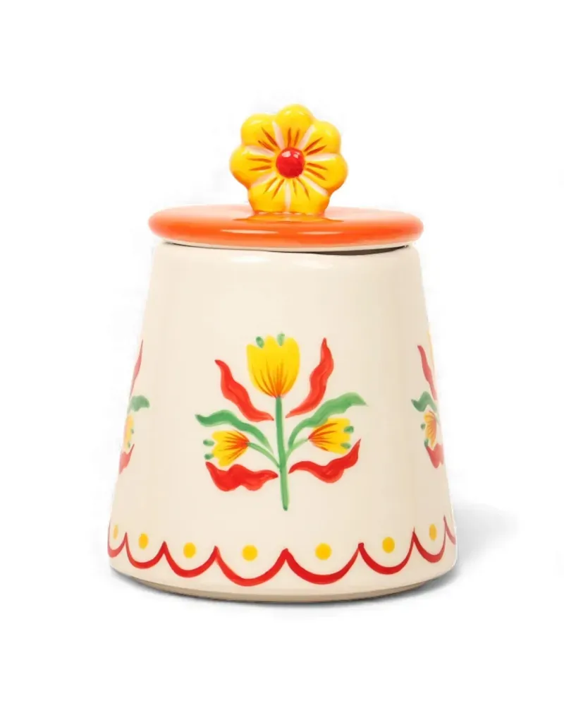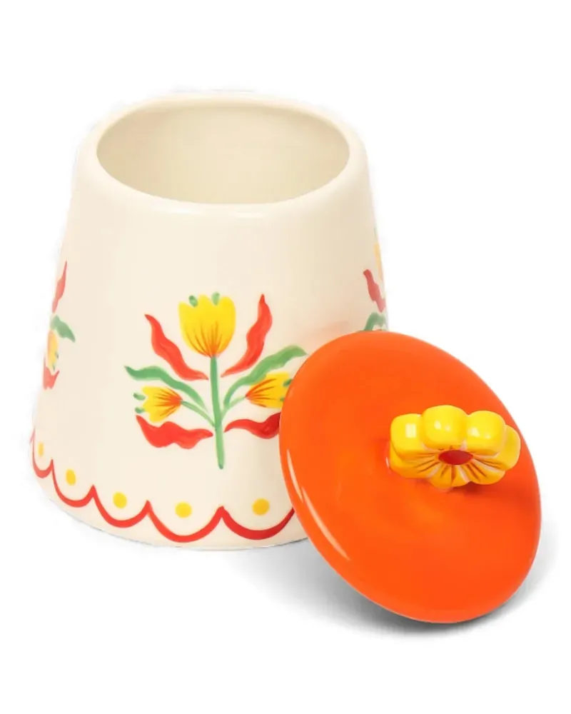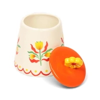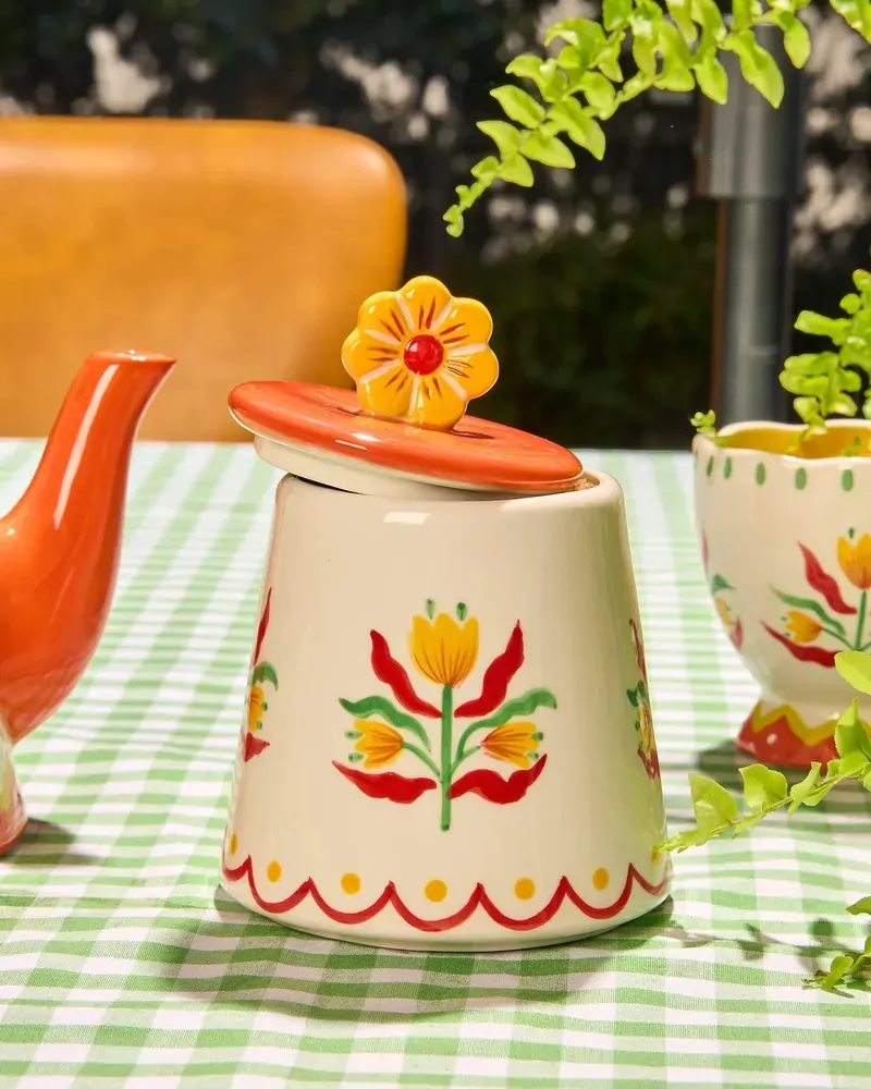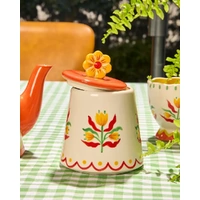 Add a touch of vintage charm to your kitchen with the Retro Folk Stoneware Hand Painted Sugar Pot. Inspired by traditional folk art, this beautifully crafted piece features a warm cream base decorated with vibrant hand-painted style florals in cheerful red, yellow and green tones. Made from durable stoneware, the sugar pot includes a fitted lid topped with a charming sculpted flower handle, adding a playful and decorative touch. The scalloped detailing around the base enhances its nostalgic character while keeping your sugar neatly stored and easily accessible. Perfect for serving sugar alongside tea or coffee, this delightful pot brings colour and personality to your breakfast table, afternoon tea setting or coffee station. It pairs beautifully with other pieces from the Retro Folk collection to create a coordinated, folk-inspired tableware display.