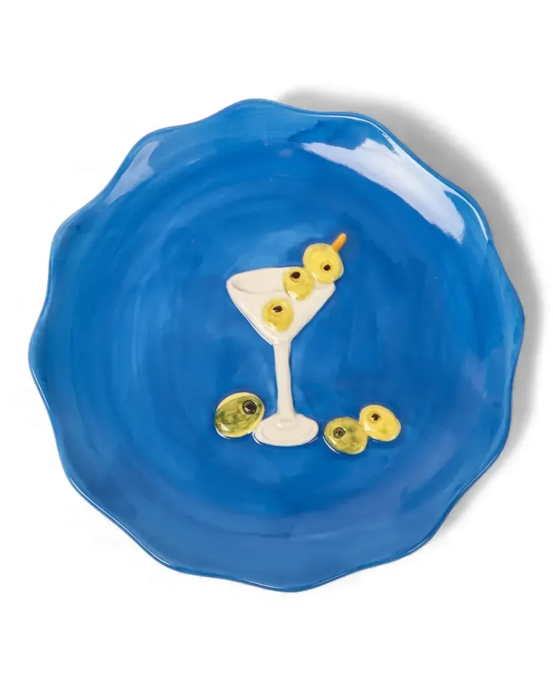 Serve snacks and small bites with a splash of seaside style using the Seaview Stoneware Cocktail Plate. Featuring a vibrant ocean-blue glaze and a playful raised martini glass design with olives, this eye-catching plate captures the relaxed spirit of coastal entertaining. Crafted from durable stoneware, the plate features a softly scalloped edge and glossy finish that adds texture and visual interest to your table setting. The sculptural cocktail motif at the centre brings a fun, celebratory touch that makes it perfect for serving appetisers, tapas or cocktail-hour treats. Ideal for summer gatherings, beach house dining or relaxed evenings with friends, the Seaview Cocktail Plate pairs beautifully with other pieces from the Seaview collection to create a colourful, coastal-inspired table.