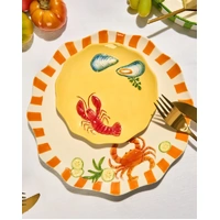 Make every meal feel like a seaside celebration with the Seaview Stoneware Crab Dinner Plate. Crafted from durable glazed stoneware, this generously sized plate features a vibrant, hand-painted design inspired by coastal dining, with playful crab, lobster and shell motifs brought to life in warm yellows, reds and fresh green accents. The softly scalloped edge and bold striped border give the plate a charming, artisanal feel, while the glossy finish enhances the colour and hand-painted details. Designed for both everyday use and entertaining, this dinner plate is ideal for serving mains, shared dishes or relaxed long lunches with friends and family. Its substantial stoneware construction offers a satisfying weight and durability, making it as practical as it is decorative. Each plate is individually hand-finished, resulting in subtle variations that add to its unique character and handcrafted appeal.