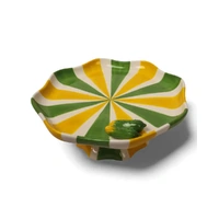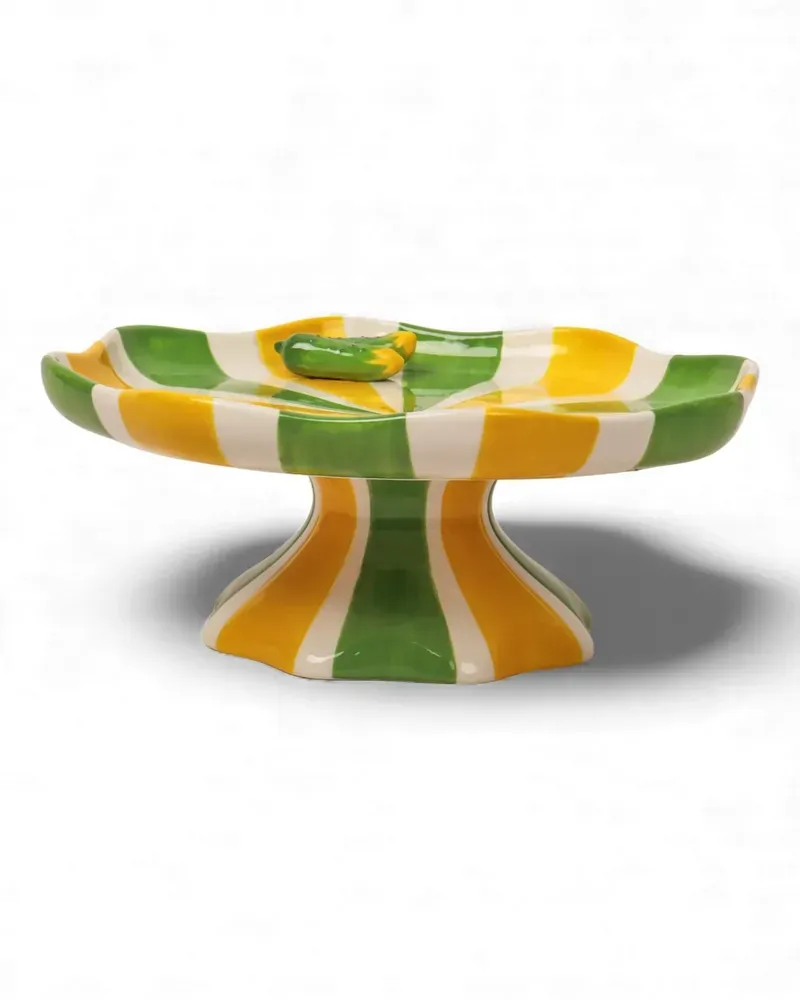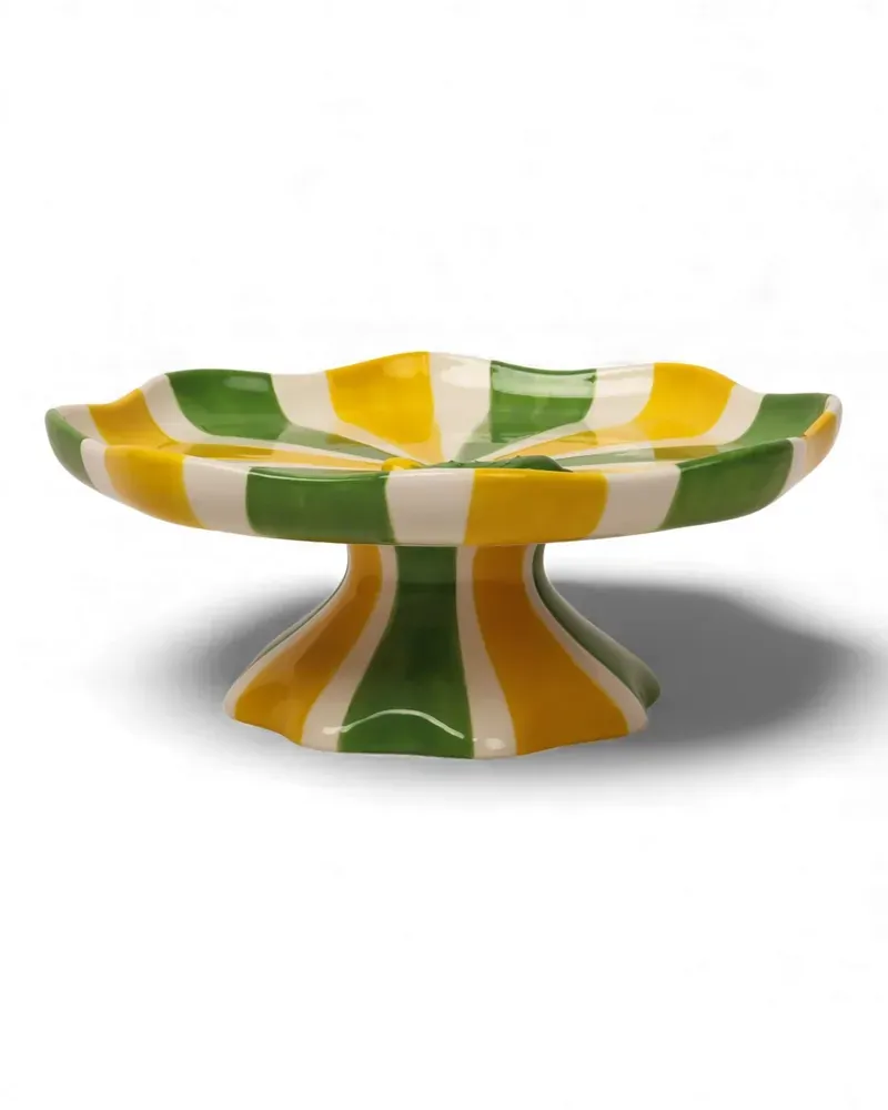 Bring colour and character to entertaining with the Seaview Stoneware Dill Platter, a playful yet practical piece designed to elevate everyday serving. Crafted from glazed stoneware, this raised platter features bold hand-painted stripes in fresh green, sunny yellow and soft cream tones, finished with a charming dill motif that adds a whimsical touch. The gently scalloped edge and pedestal base give the platter height and presence, making it ideal for styling at the centre of the table. Perfect for serving cheeses, crackers, appetisers or desserts, it allows food to be beautifully displayed while remaining easy to reach. The glossy glaze enhances the vibrant colours and makes the platter suitable for both casual gatherings and more considered table settings. Designed to be as decorative as it is functional, this stoneware platter looks just as lovely on open shelving or a sideboard when not in use. Its bold colour palette and retro-inspired design make it a standout piece that brings personality to your home. Part of the Seaview collection, the Dill Platter pairs effortlessly with coordinating serveware for a cohesive, joyful tablescape. Whether chosen for entertaining, everyday use or gifting, this platter is a celebration of colour, craftsmanship and relaxed, feel-good hosting.