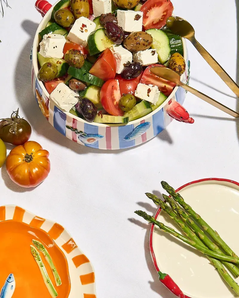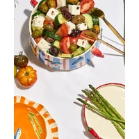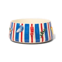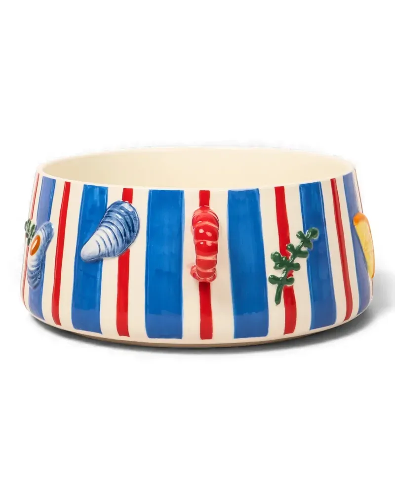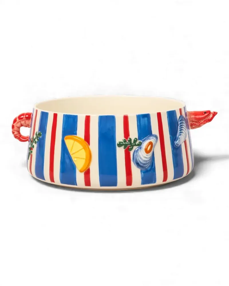 Playful, bold and designed to stand out, the Seaview Stoneware Prawn Pot brings a joyful coastal feel to your table. Crafted from glazed stoneware, this eye-catching piece features hand-painted blue and red stripes accented with raised seafood motifs, including prawns, shells and citrus details that add texture and character from every angle. Designed with small side handles for easy serving, the prawn pot is perfect for presenting snacks, sides or shared dishes. Ideal for serving prawns, olives, dips or bread, its generous bowl shape makes it as functional as it is decorative. The glossy finish enhances the vibrant colours while making the piece easy to wipe clean after use. Whether styled as part of a relaxed seafood spread or used as a statement serving bowl for everyday entertaining, this pot brings personality and charm to any occasion. It also looks striking displayed on open shelving or a sideboard when not in use, adding a pop of colour to your kitchen or dining space. Part of the Seaview collection, the Stoneware Prawn Pot pairs beautifully with coordinating serveware for a cohesive and playful tablescape. A perfect gift for entertainers or lovers of bold, character-filled homewares, its a celebration of colour, craftsmanship and laid-back coastal style.