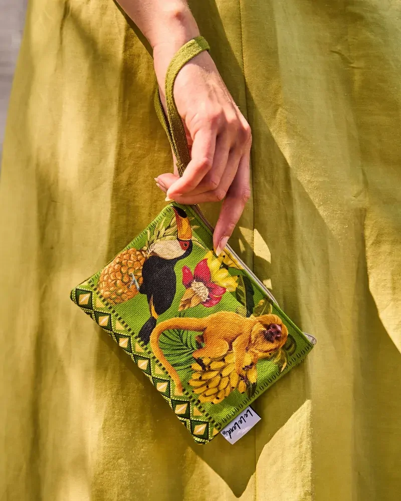 Playful, bold and full of personality, the Brazilian Summer Monkey Coin Purse is a vibrant everyday accessory inspired by lush tropical landscapes. Featuring La La Land’s signature Brazilian Summer artwork, this compact purse showcases an illustrated monkey perched among banana leaves, exotic birds and bright florals, set against rich green tones and decorative geometric detailing. Crafted from durable woven fabric, this coin purse is designed to balance practicality with standout style. The secure zip-top closure keeps loose change, cards, keys or small essentials safely contained, while the attached wrist strap makes it easy to carry or slip over the wrist when you’re on the go. Finished with La La Land branding, it reflects the brand’s attention to detail and love of expressive illustration.