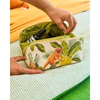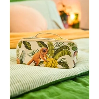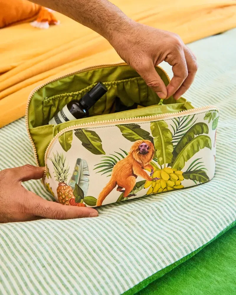 The best selling cosmetic bag returns in the vibrant Brazilian Summer design, bringing colour, personality and practicality to your everyday routine and travel essentials. Featuring bold, tropical-inspired artwork with playful wildlife and lush foliage, this statement cosmetic bag captures the energy and warmth of a Brazilian summer. Printed on water-resistant vegan leather, our cosmetic bag is your perfect travel companion for packing skincare and makeup on your next trip away. The structured silhouette opens wide for easy access, while the spacious interior includes multiple compartments to keep your beauty essentials organised and secure. A sturdy zip closure and convenient top handle make it ideal for both travel and daily use. Designed to balance function with eye-catching style, this cosmetic bag is perfect for weekends away, overnight stays or simply elevating your bathroom bench. The durable, wipe-clean exterior ensures its made to withstand life on the go while maintaining its vibrant finish.