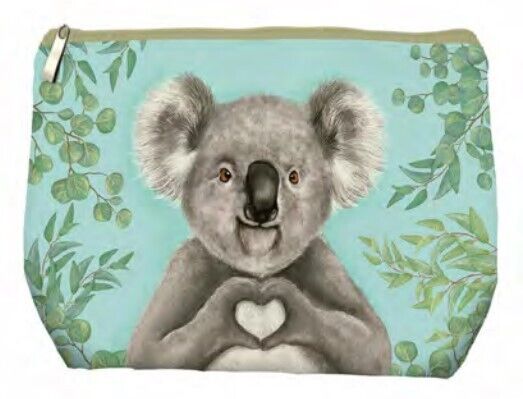 Introducing the Happy Days Bob the Koala Holiday Pouch. Crafted from durable cotton, this self-standing pouch boasts adorable artwork of a lovable koala named Bob making a heart symbol with his fuzzy paws against a serene background of eucalyptus branches. This pouch not only offers versatility and style for your travels, it's perfect for keeping your essentials organised whether you're jet-setting or packing for a weekend away.