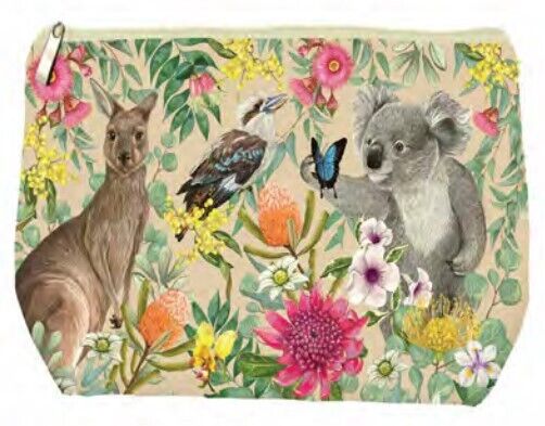 Introducing the Happy Days Bush Beauties Holiday Pouch. Crafted from durable cotton, this self-standing pouch boasts stunning artwork of Aussie animals including a kangaroo, a koala and a kookaburra amongst beautiful native fauna. This pouch not only offers versatility and style for your travels, it's perfect for keeping your essentials organised whether you're jet-setting or packing for a weekend away.