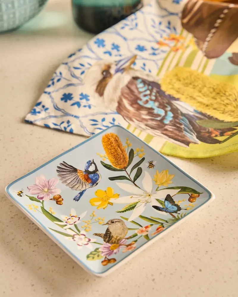 Bring a touch of nature-inspired charm into your home with the Square Trinket Tray – Backcountry. Crafted from glazed ceramic, this beautifully illustrated tray showcases native birds, delicate wildflowers and foliage in soft, calming tones inspired by the Australian backcountry. Perfectly sized for holding jewellery, keys or small everyday essentials, the square shape offers a compact yet eye-catching way to keep your space organised. The smooth glazed finish ensures easy cleaning, while gently raised edges help keep items secure and neatly contained. Designed to sit effortlessly on a bedside table, bathroom vanity or desk, this trinket tray balances practicality with decorative appeal. Fine detailing and a subtle coloured rim frame the artwork, allowing the intricate illustrations to take centre stage.