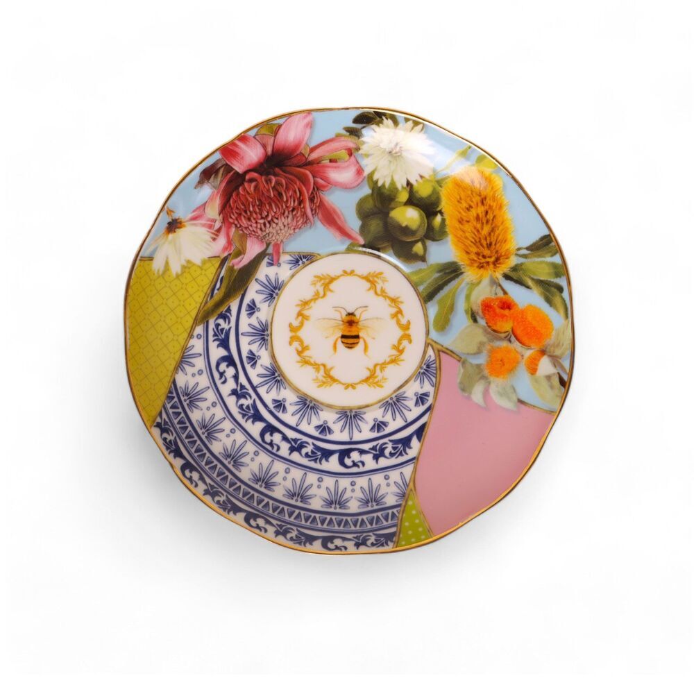 This illustrated ceramic tea cup with matching saucer features stunning artwork inspired by native Australian flora and fauna in our Pieces Of Poetry design, each element bordered with gold, kintsugi-styled edging, bringing the serene beauty of Australian nature to your tea time.