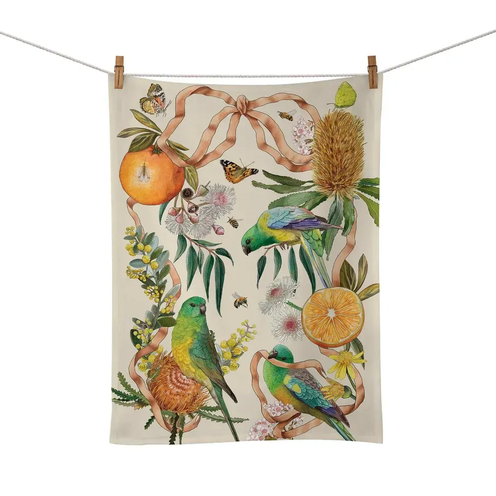 Golden Hour is an ode to light, warmth, and the natural elegance of the Australian landscape, when the sun dips low and the landscape is washed in warm, honeyed light. Illustrated by in-house artist Laura Ramos, this collection captures the nostalgic glow of golden hour through intricate drawings of Grevilleas, succulent oranges, and native blooms, all delicately entwined with flowing feminine ribbons and bows. Hints of soft blue and eucalyptus green contrast beautifully with sun-soaked yellows and earthy oranges, evoking the feeling of a late summer afternoon. Among the designs are charming Queenslander-style homes, a nod to relaxed, open-air living that allows you to bask under the sun all day long.