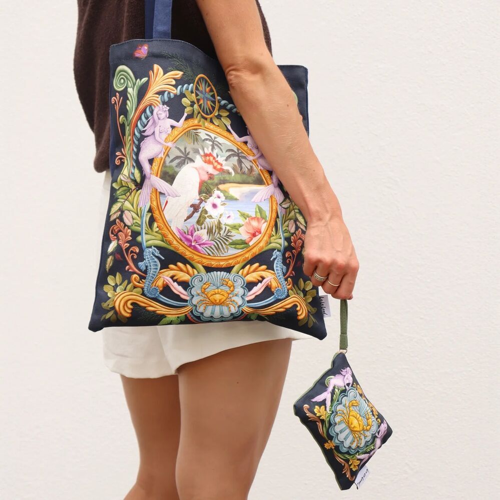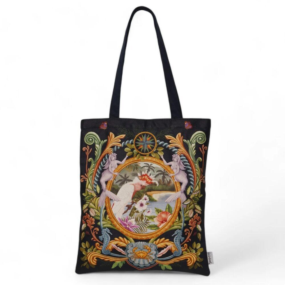 Adorned with lllustrated nautical themed elements like mermaids, compasses, sailor ropes and crustaceans, framing a stunning pink cockatoo. Carry your essentials with a blend of functionality and Australian nautical flair with La La Land's Majestic Coast Tote.