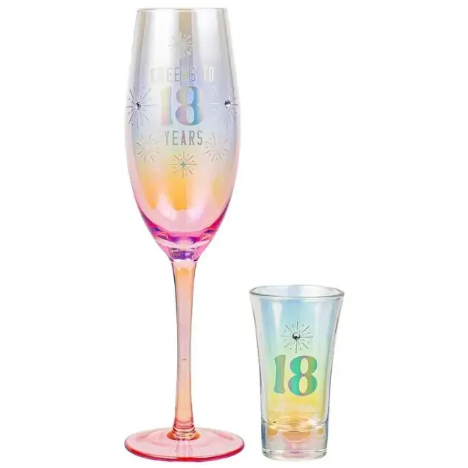A pretty champagne and shot glass set with a holographic finish - the perfect gift for an 18th. The champagne glass has fireworks motifs with diamantes to make them stand out, and text reading 'Cheers to 18 years'. The shot glass is also holographic and reads '18'.