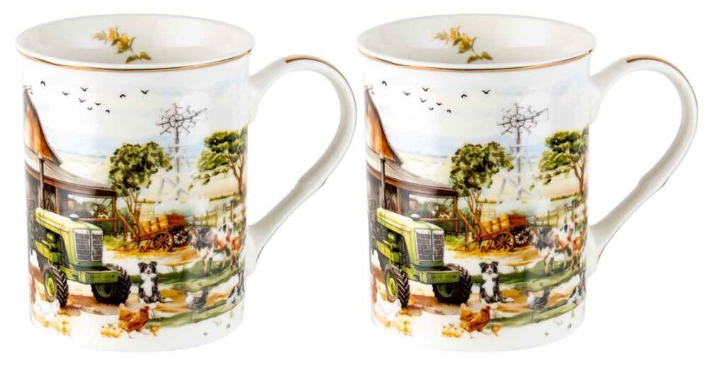 Part of the Country Life collection, this set of 2 mugs depicts beautiful scenes of life on a farm, including a tractor, a barn, and various farm animals.