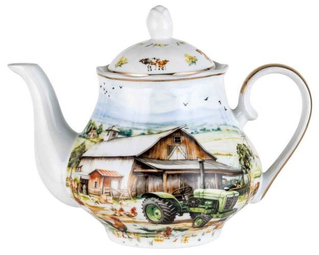 Part of the Country Life collection, this teapot depicts beautiful scenes of life on a farm, including a tractor, a barn, and various farm animals.