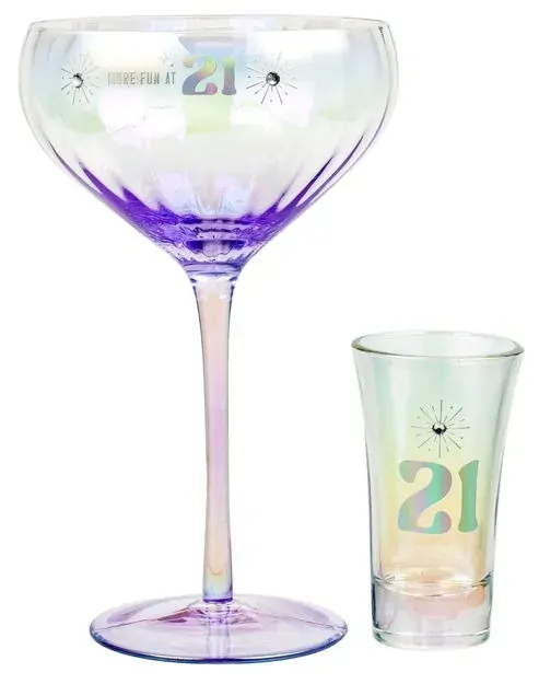 A pretty coupe and shot glass set with a holographic finish - the perfect gift for a 21st. The coupe glass has fireworks motifs with diamantes to make them stand out, and text reading 'More fun at 21'. The shot glass is also holographic and reads '21'.