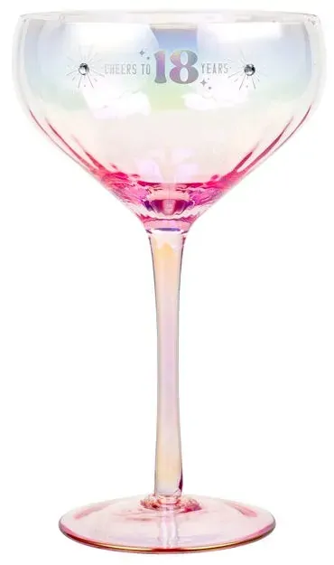 A pretty coupe glass with a holographic finish - the perfect gift for an 18th. The glass has fireworks motifs with diamantes to make them stand out, and text reading 'Cheers to 18 years'.