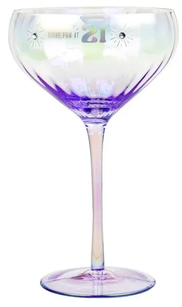 A pretty coupe glass with a holographic finish - the perfect gift for a 21st. The glass has fireworks motifs with diamantes to make them stand out, and text reading 'More fun at 21'.