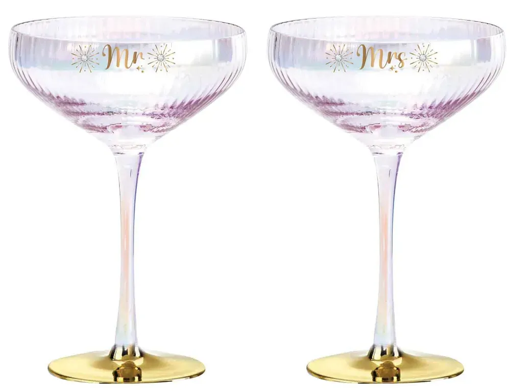 A pretty couple glass set with a holographic finish - the perfect gift for a newly married couple. Both glasses have a gold-coloured base and text on each one reading 'Mr' and 'Mrs', with firework motifs embellished with diamantes.
