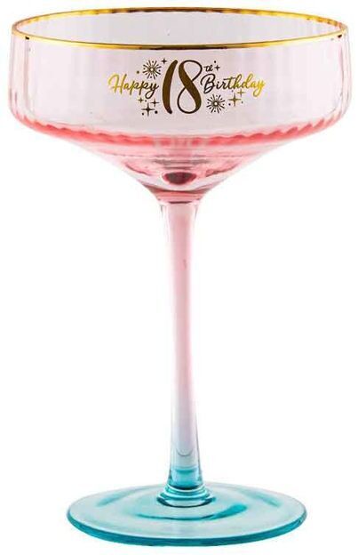 A pretty fluted coupe glass in a pink shade, with a gradient turquoise blue base and gold details, including script reading 'Happy 18th Birthday' and a golden rim.