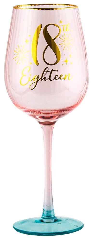 A pretty fluted wine glass in a pink shade, with a gradient turquoise blue base and gold details, including script reading '18 / Eighteen' and a golden rim.