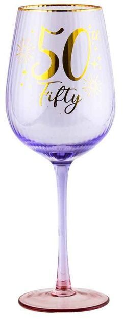 A pretty fluted wine glass in a purple shade, with a gradient rose pink base and gold details, including script reading '50 / Fifty' and a golden rim.