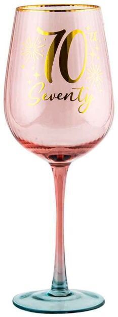 A pretty fluted wine glass in a rose pink shade, with a gradient teal blue base and gold details, including script reading '70 / Seventy' and a golden rim.