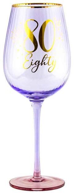 A pretty fluted wine glass in a purple shade, with a gradient rose pink base and gold details, including script reading '80 / Eighty' and a golden rim.