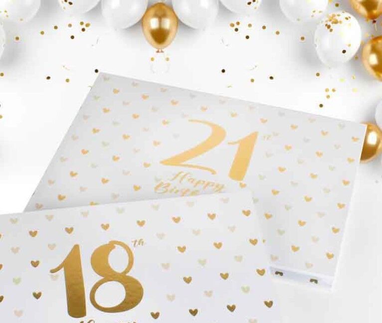 The perfect guest book for a 21st birthday! This guest book is in white with gold detailing, including a pattern of hearts all over and text on the cover reading '21 / Happy Birthday / May all your dreams & wishes come true'.