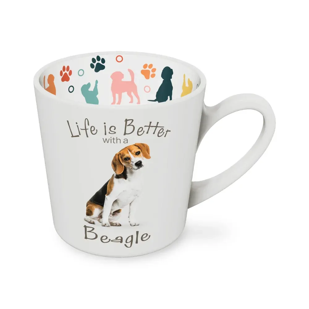 This mug reads 'Life is better with a Beagle', with an accompanying image of the breed and featuring colourful dog motifs on the inside walls of the mug.