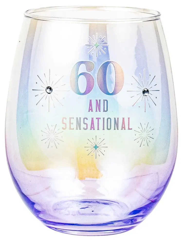 A pretty stemless glass with a holographic finish - the perfect gift for a 60th. The glass has fireworks motifs with diamantes to make them stand out, and text reading '60 and sensational'.