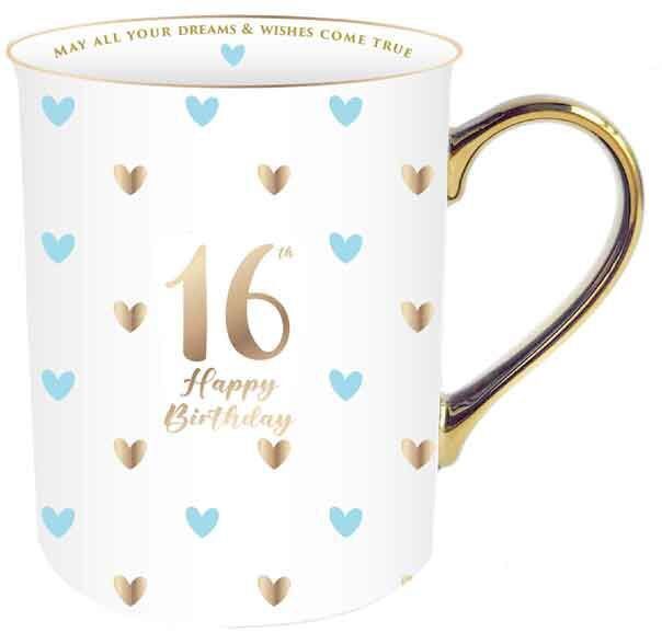 The perfect small gift for a 16th! This mug is in white with a blue and gold heart motif, plus a gold handle & rim and script reading '16th / Happy Birthday'. Text on the lip of the mug reads 'May all your dreams & wishes come true'.
