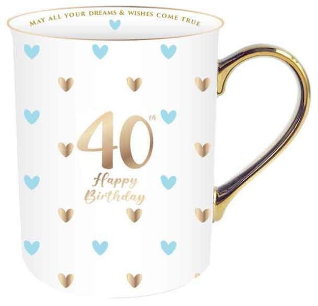 The perfect small gift for a 40th! This mug is in white with a blue and gold heart motif, plus a gold handle & rim and script reading '40th / Happy Birthday'. Text on the lip of the mug reads 'May all your dreams & wishes come true'.