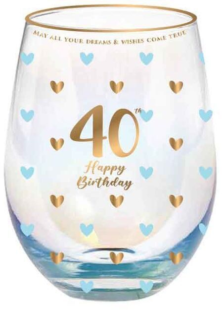 A pretty stemless glass with a motif of blue & gold hearts and other gold details inlcuding a golden rim, plus script reading '40th / Happy Birthday'. Text along the lip of the glass reads 'May all your dreams & wishes come true'.