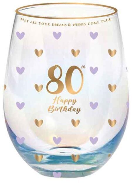 A pretty stemless glass with a motif of purple & gold hearts and other gold details inlcuding a golden rim, plus script reading '80th / Happy Birthday'. Text along the lip of the glass reads 'May all your dreams & wishes come true'.