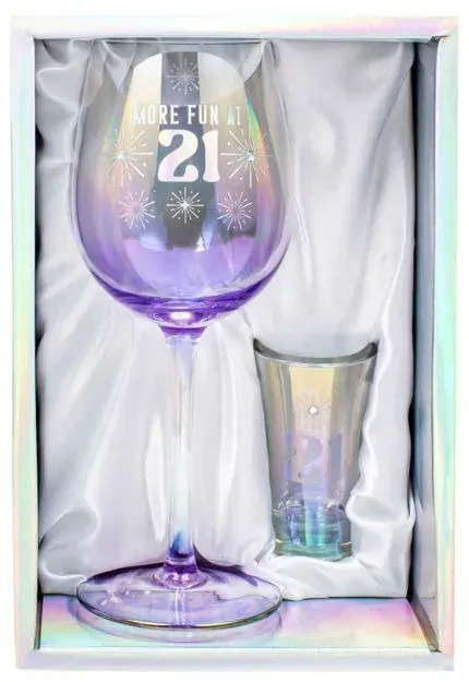 A pretty wine and shot glass set with a holographic finish - the perfect gift for a 21st. The wine glass has fireworks motifs with diamantes to make them stand out, and text reading 'More fun at 21'. The shot glass is also holographic and reads '21'.