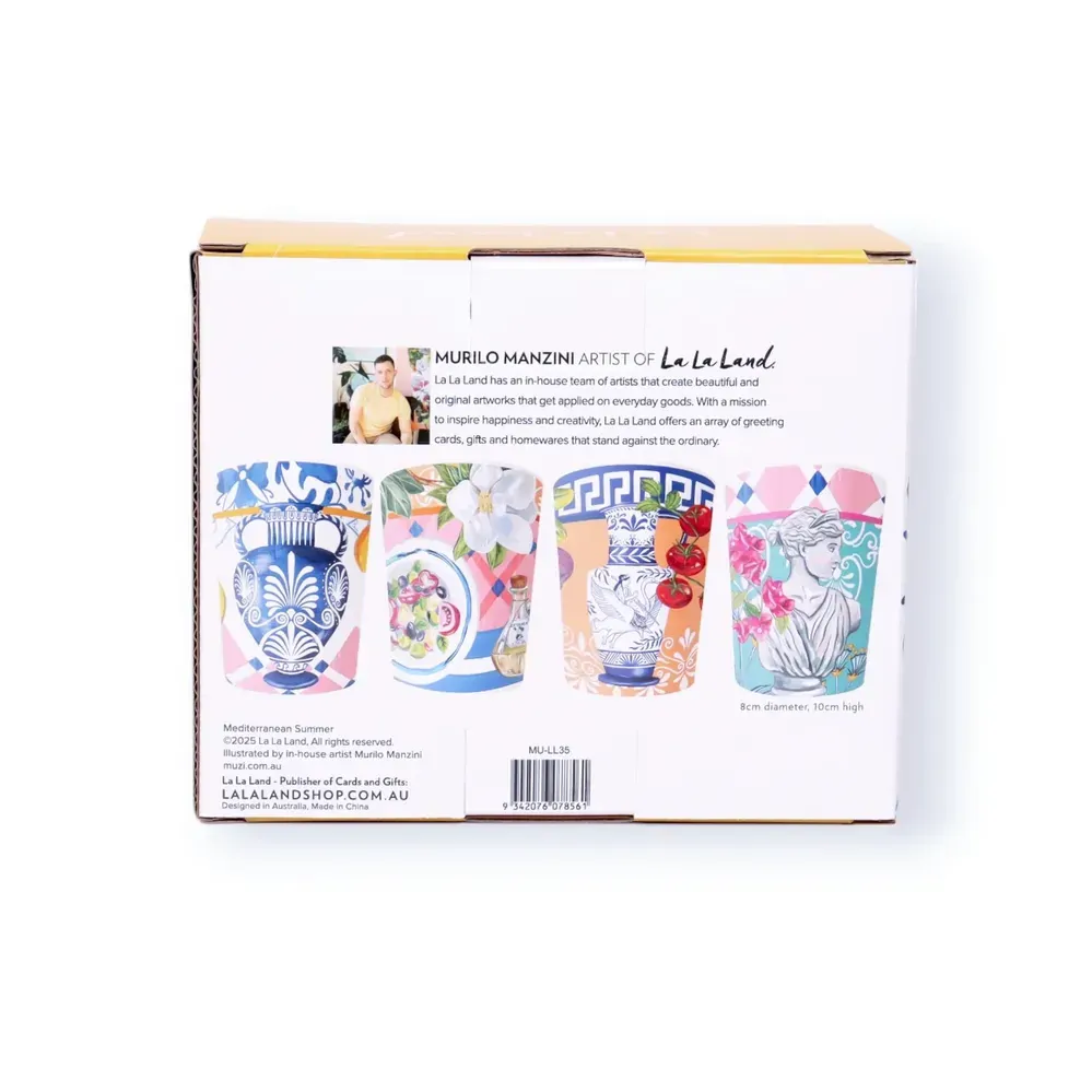 Crafted from durable melamine, this set of four cups brings the vibrant flavours of the Mediterranean to your table with captivating illustrations. From fresh vegetables to olive oil to iconic greek ceramics, each cup showcases the essence of Mediterranean indulgence. Elevate your dining experience and add a touch of Mediterranean flair to your meals with La La Land's Mediterranean Summer Cup Set, perfect for using at home or taking out for picnics.