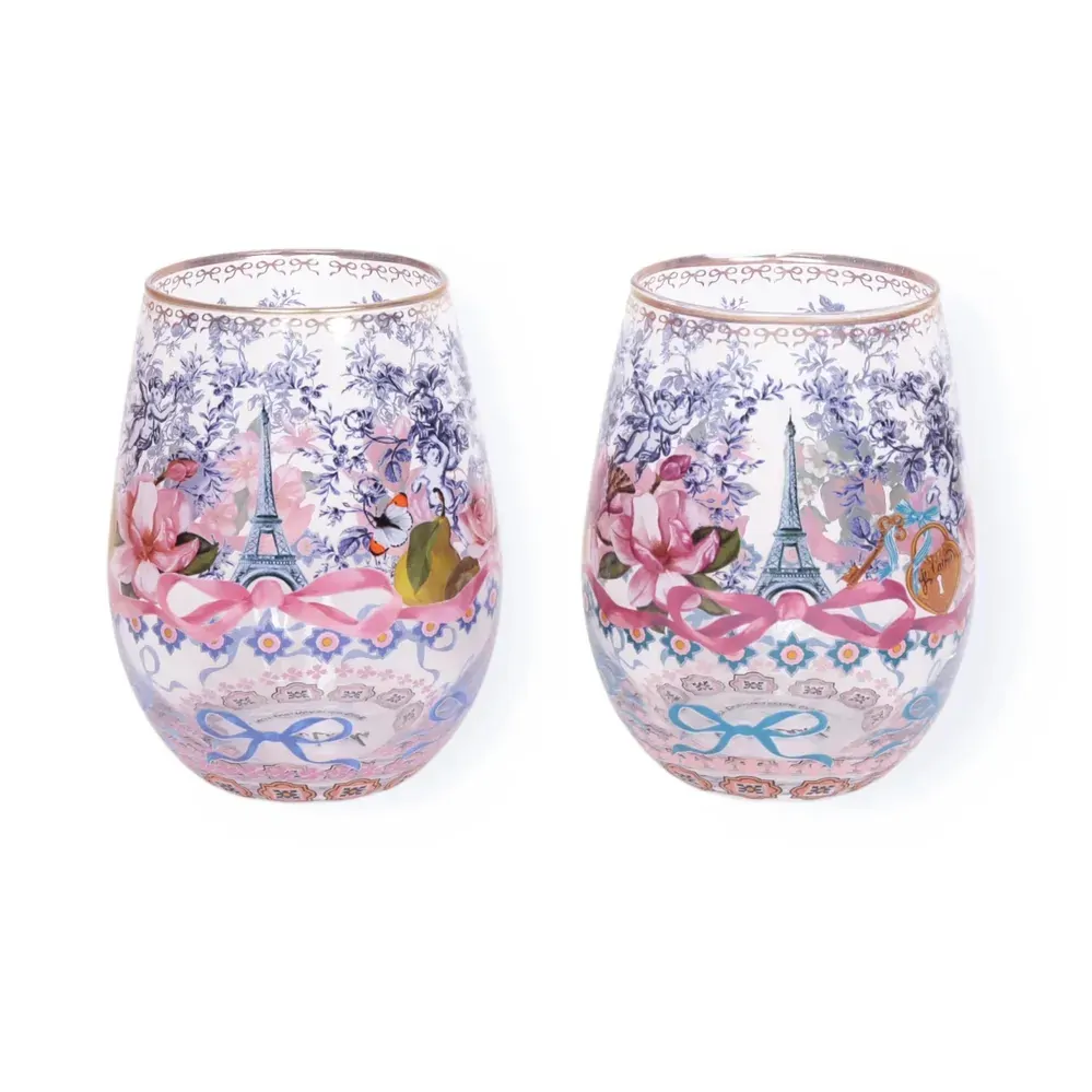 Introducing the Je'Taime Paris Glass Tumblers, a set of two exquisite glassware pieces that effortlessly combine elegance and artistry. These tumblers will elevate your dining experience and showcase the stunning Parisian-inspired illustrations by the talented artist Murilo Manzini. Each tumbler is a work of art in itself. The delicate glassware is adorned with Murilo Manzini's captivating illustrations, depicting blue filigree elements, ribbons, florals and sweet treats. The meticulous attention to detail, combined with the addition of shimmering gold foil accents, creates a truly enchanting set of glasses.
