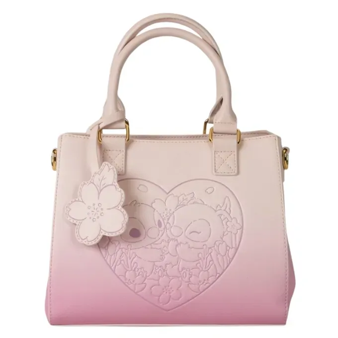 Keep your best boojiboos forever (BBFs) close with a fashionable flair. Take along this Disney's Stitch and Angel crossbody bag. This accessory shimmers in shades of soft pink. The front features an embossed heart that frames a charming moment between Stitch and Angel, unfolding among the flowers. A cherry blossom vegan leather charm tops off the look. There's enough room for packing just what you need for a fun-filled day of sweet adventures.