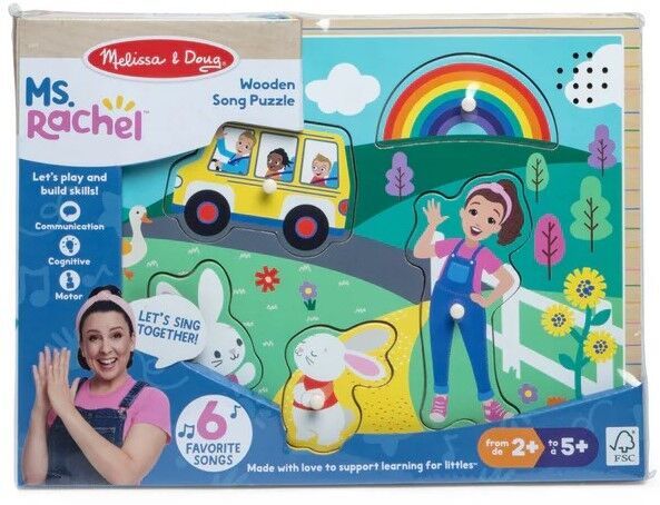 Kids will love singing along with their favourite educator, Ms. Rachel! The six-piece Melissa & Doug Ms. Rachel Wooden Song Puzzle includes favorites from Ms. Rachels popular baby and toddler videos. Lift to hear Come Play Out In the Sun, The Wheels on the Bus, I Love a Rainbow, Can You Say Mama, Hop Little Bunnies, and Im So Happy. An on/off switch allows quiet play. (2 AAA batteries required, not included. Sounds are light-activated - for best results, use puzzle in bright, direct light.) Durable pegs help kids two and older easily grasp and manipulate the six adorably illustrated pictures and pictures under pieces help with matching and boost self-esteem. Encourage language, memory, spatial awareness, problem-solving skills and more with this Melissa & Doug puzzle and Melissa & Doug toys. These Melissa & Doug toys are toddler learning toys, designed by Ms. Rachel and developmental experts to support all children, through their ages and stages, from 2-5+ years. Ms. Rachel toys are ideal newborn toys, toddler toys, preschool toys, Montessori toys, and wooden toys for ages 2-4. From baby shower gifts to baby essentials, these products help babies and families learn, bond, and thrive. Ms. Rachel is a real teacher with two master's degrees in education. She is passionate about creating research-based videos and products to educate families and support learning for littles.