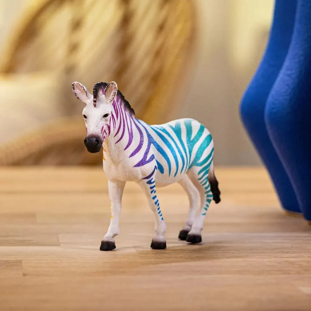 The popular Schleich zebra is now available in a 90th anniversary edition. It is one of the most iconic animals in the anniversary run. It has an exclusive special paint with white fur and colourful stripes in a rainbow design. This is a very special, strictly limited collectible figurine. The zebra is a great gift for collectors and Schleich lovers!