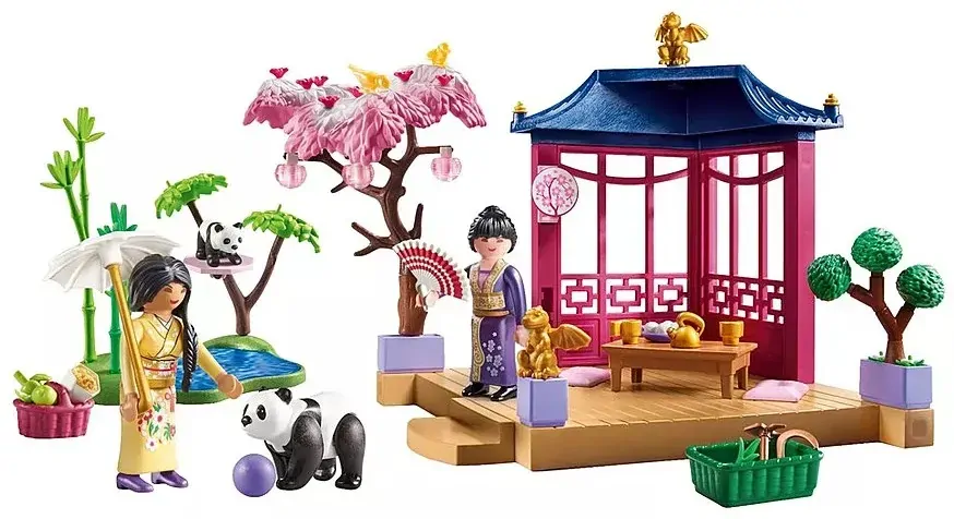 Set includes 2 women, 1 panda, 1 panda baby, 2 birds, 1 open building, 1 pond area, 3 bamboo plants, 1 branch with foliage and platform, 1 ball, 2 apples, 1 cherry tree with blossoms and 3 lanterns, 1 bonsai, 1 fan, 1 umbrella, 1 basket, 1 feed, 1 plant, 2 flower boxes, 1 box, 2 gardening tools, 1 scissors, 1 table, 2 cushions, 2 cups, 1 teapot, 2 chopsticks, 1 plate, 4 sweets, 2 dragon figures.