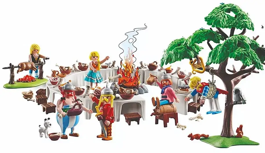 Set includes Obelix, Cacofonix, 2 Gauls men and 2 Gaulish women, Idefix, 2 squirrels, 1 owl, 6 tables, 1 fireplace, 1 fireplace with rotisserie, 18 stools, 18 drinking cups, 18 plates, 18 stools, 3 logs of wood, 4 fish bones, 4 fishes, 4 ham, 1 bread, 1 beer tavern, 3 wild boar roasts, 5 meat with bones, 1 tree.