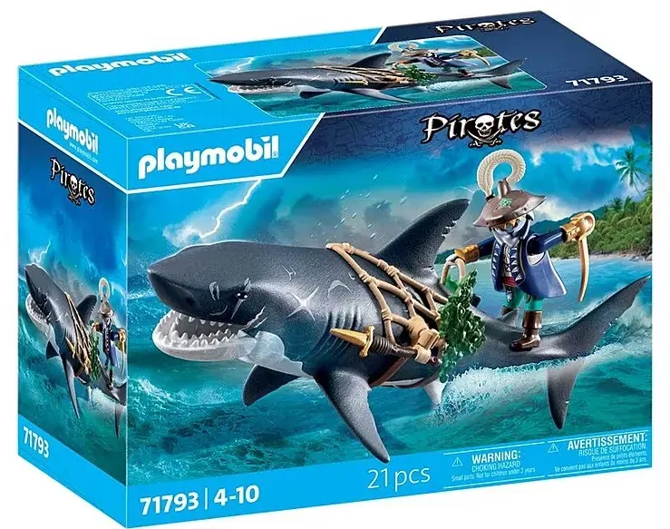 In the deep waters of the pirate world, a monstrous giant shark and a ruthless shark-pirate lurk! By pulling a lever, the huge mouth of the shark opens, capable of trapping a pirate inside. Released quickly, the mouth snaps shut automatically. Riding through the seven seas, the shark-pirate clings to the monster shark's net with his saber drawn. The giant shark can swim in the water.