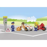 Set includes 1 woman doctor, 1 firefighter, 1 policeman, 1 emergency medical car, 1 firefighter motor bike, 1 traffic light, 1 emergency medial kit, 1 warning triangle.