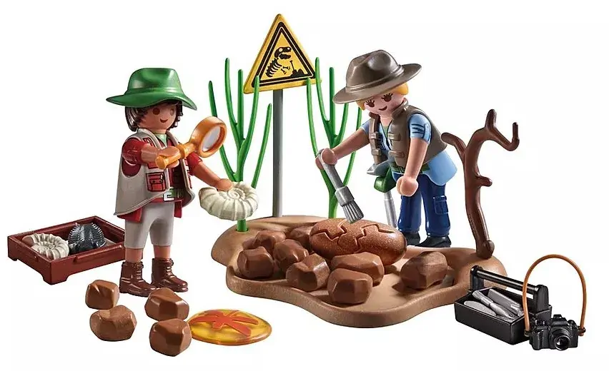 Set includes 1 man, 1 woman, 1 base plate with branch and 2 bushes, 1 earth element for digging, 1 warning sign, 1 craft box with explorer equipment, 1 magnifying glass, 1 box with fossils.