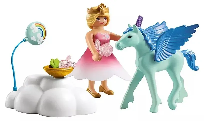 The intricate details of this PLAYMOBIL set bring the celebration to life. The cloud pedestal offers a dreamy backdrop while the princess's removable silicone skirt and sparkling crown add royal elegance. Each accessory is designed to capture the magic of a birthday, inviting imaginative play and creative storytelling that make every moment unforgettable. This PLAYMOBIL set transforms every play session into a vibrant celebration of fairytale magic. The Princess holds a floating balloon with grace, while the Pegasus foal tilts its head in playful wonder. Detailed accessories like apples and a comb enhance the festive spirit. Every element invites creative storytelling and imaginative adventures, making each birthday an epic journey into endless magical fun.