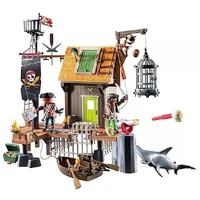 The large PLAYMOBIL pirate port serves not only as a docking station for proud pirate ships, but also as a dreaded prison! In the large cage basin under the guardhouse, which is also accessible through a trapdoor, dangerous sharks or rival pirates can be detained! In the crow's nest, an alarm is immediately sounded in case of danger: The skull cannon and the large rotating barrel, from which smaller barrels can be thrown at attackers, defend the harbor against intruders.