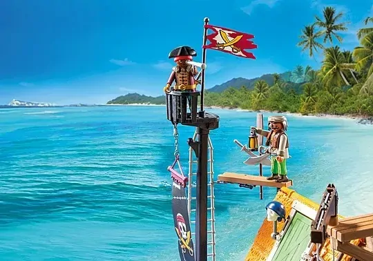 Set includes 2 pirates, 1 hammerhead shark, 2 flags, 1 flagpole, 1 mast with stork's nest, 1 banner, 1 chain, 1 shroud, 2 wooden planks, 3 oars, 2 double sabers, 2 adapters, 1 house, 1 door, 2 windows, 8 timber posts, 1 roof, 1 skull, 2 headscarves, 1 ladder, 1 crane boom, 2 ropes, 1 cage, 3 barrels, 1 barrel holder, 1 pier, 1 hatch, 5 grids, 1 cage top grid, 3 rocks, 2 tree connectors, 6 bollards, 1 fence, 1 collapsing pier, 1 fire bowl with fire, 1 cannon, 1 cannon holder, 2 skull projectiles, 1 boat, 1 bench, 1 boat, 2 oar holders, 1 map, 1 hat, 1 binoculars, 2 sabers, 2 arm cuffs, 1 pistol, 1 rope ladder, 1 chest, 1 lamp, 1 knife, 1 cutting board, 1 ham, 1 straw bedding, 1 lamp with fire, 4 break-through boards, 2 torch holders, 2 adapter crossbars, 2 bolts, 3 adapters, 1 clip, 1 hook, 4 handle adapters.