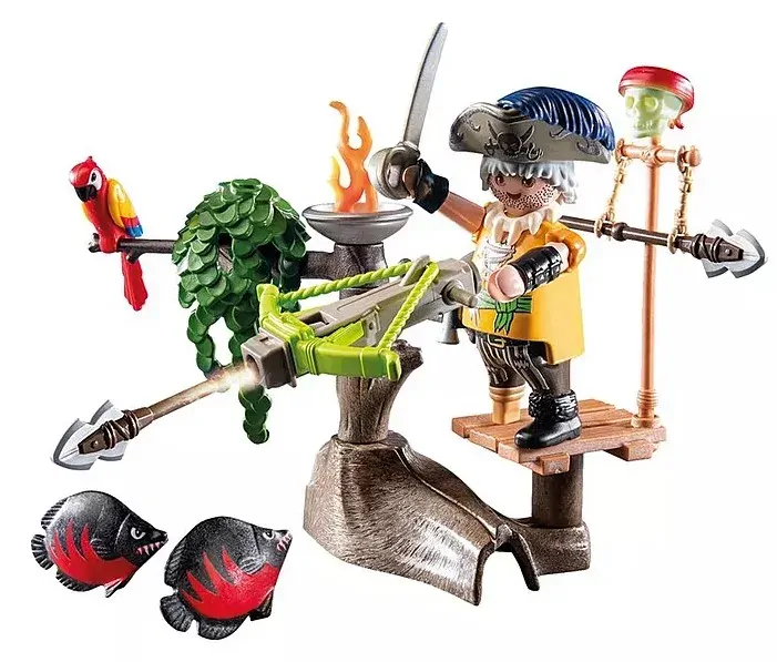 Set includes 1 pirate, 2 fish, 1 tree stump, 2 branches, 1 tree extension, 1 fire bowl with fire, 1 hanging plant, 1 pedestal, 1 wooden cross, 1 skull, 1 headband, 2 projectiles, 1 projectile holder, 1 ballista, 1 hat, 1 feather for hat, 1 pistol, 1 dagger, 1 clip, 2 arm cuffs.